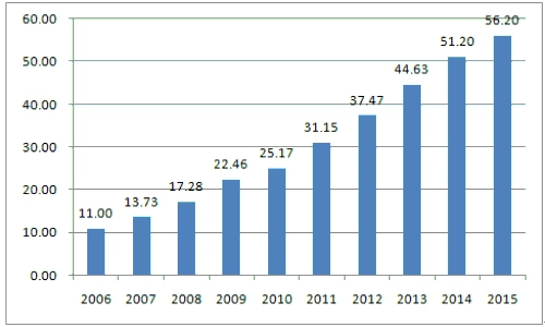 我國的城鎮(zhèn)化率在不斷提高,“十二五”期間,我國城鎮(zhèn)化進程穩(wěn)步推進,城鎮(zhèn)化率顯著提升,年均提高1.23個百分點,每年城鎮(zhèn)人口增加2000萬,到2015年,我國的城鎮(zhèn)化率已經(jīng)提高至56.1%,城鎮(zhèn)常住人口為7.71億。盡管如此,我國城鎮(zhèn)化率還是遠低于發(fā)達國家80%的平均水平,也低于人均收入與我國相近的發(fā)展中國家60%的平均水平,還有較大的發(fā)展空間。