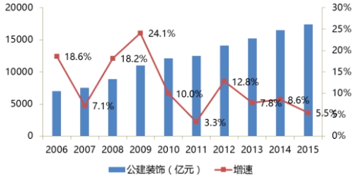 2006年至2015年全社會固定資產(chǎn)投資完成額近20%的年復(fù)合增長率將在未來十年內(nèi)體現(xiàn)在公共裝飾存量市場改造的市場增速上,帶來存量改造市場的黃金發(fā)展期。