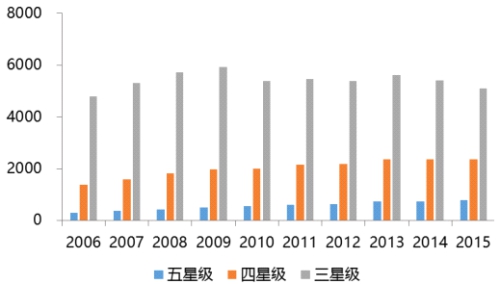 高端星級酒店存量改造市場年均增速料將超過10%。隨著國內(nèi)商務(wù)活動的逐漸增多和旅游的興起,國內(nèi)星級酒店得到了快速發(fā)展。截止到2015年,全國星級飯店統(tǒng)計管理系統(tǒng)中共有12327家星級飯店,其中五星級789家,四星級2375家,三星級5098家。2006-2015年度,全國五星級、四星級、三星級酒店數(shù)量的年均增長率為11.26%、6.31%、0.72%,呈現(xiàn)出較平穩(wěn)的發(fā)展態(tài)勢。未來幾年,十年內(nèi)新開業(yè)的高端星級酒店,特別是五星、四星酒店將迎來重新裝飾改造的高峰。