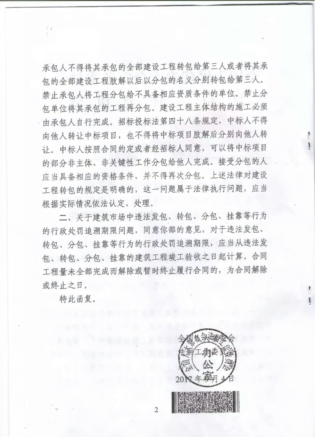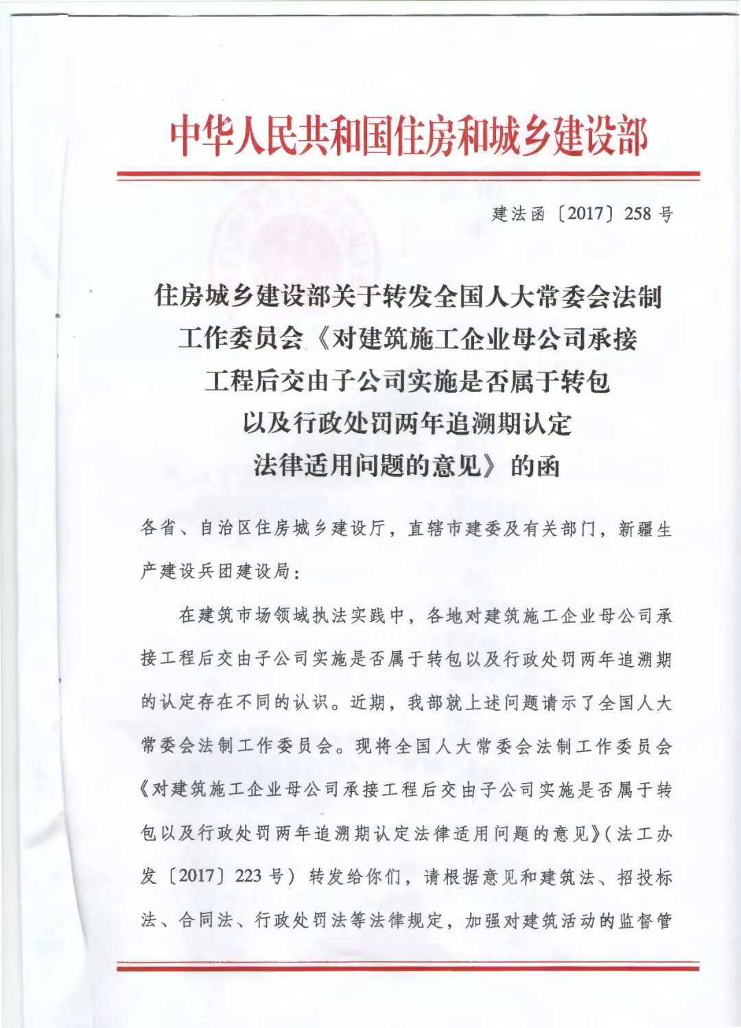 近日,住房與城鄉(xiāng)建設(shè)部向全國(guó)人大常委會(huì)法制工作委員會(huì)(下稱“全國(guó)人大法工委”)發(fā)出請(qǐng)示函,全國(guó)人大法工委作出《對(duì)建筑施工企業(yè)母公司承接工程后交由子公司實(shí)施是否屬于轉(zhuǎn)包以及行政處罰兩年追溯期認(rèn)定法律適用問(wèn)題的意見(jiàn)》(法工辦發(fā)[2017]223號(hào),以下簡(jiǎn)稱《意見(jiàn)》),其第一點(diǎn)認(rèn)為: