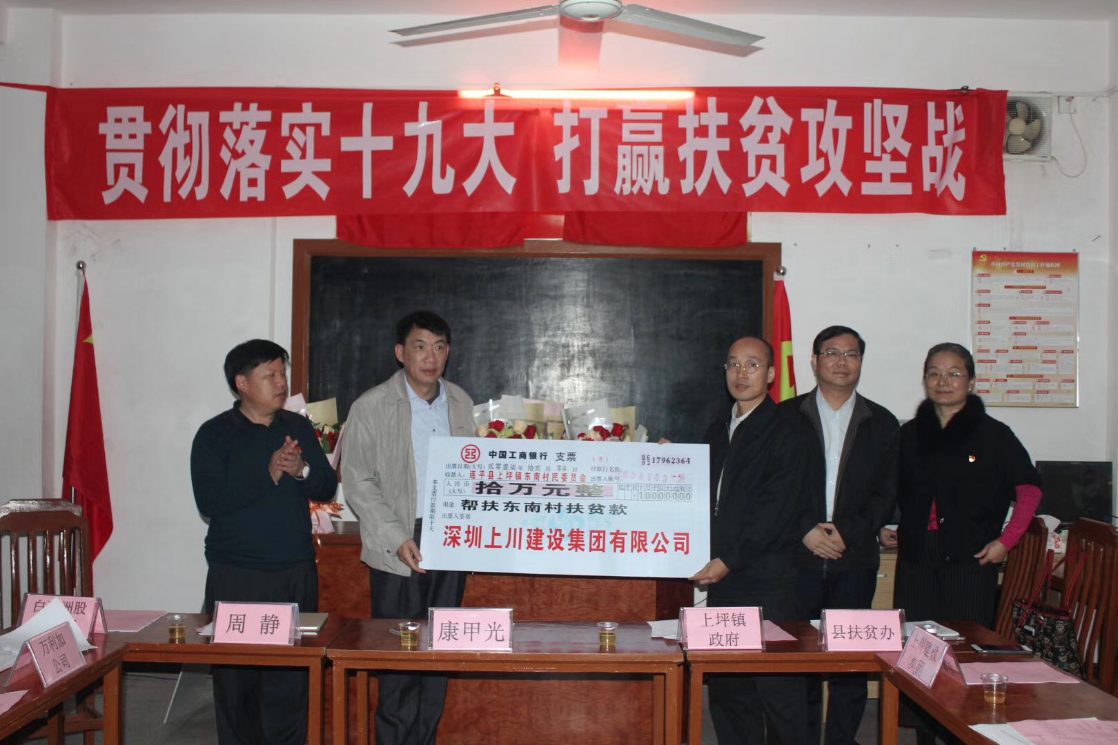 2017年12月7日,在深圳南山沙河街道領導的牽線搭橋下,深圳上川建設集團有限公司的董事長謝佳琪、副總經(jīng)理陸偉一行到上坪鎮(zhèn)東南村開展捐贈幫扶活動。沙河街道對口幫扶貧困村----河源市連平縣上坪鎮(zhèn)東南村開展關愛貧困戶活動,為該村貧困戶送上慰問金和慰問品,在秋意寒涼之時為其帶去關懷和溫暖,旨在貫徹落實十九大,打贏扶貧攻堅戰(zhàn)。